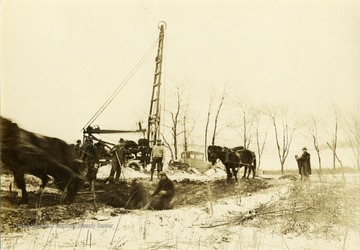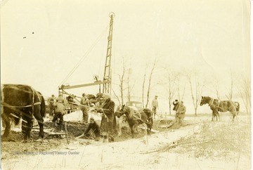 - Several men digging and preparing for excavation and well drilling in Arthurdale, West Virginia.
