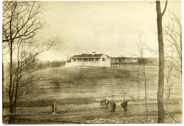 Men laying foundation for Power House.  Arthur mansion visible in the background.<br />