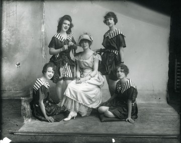 - Seven female entertainers, two clowns, a man wearing a top hat, and two other male entertainers are standing in a line.