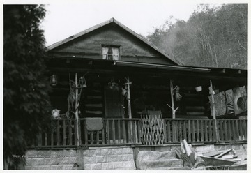 - House has a metal roof; young boy standing next to porch. Laundry hanging and wash tubs on porch.