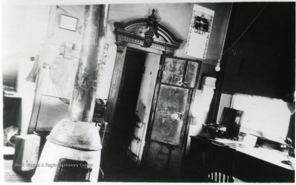 - Interior of Fire Creek Office. Stove is in the center of the room and a desk and cabinet is off to the left.