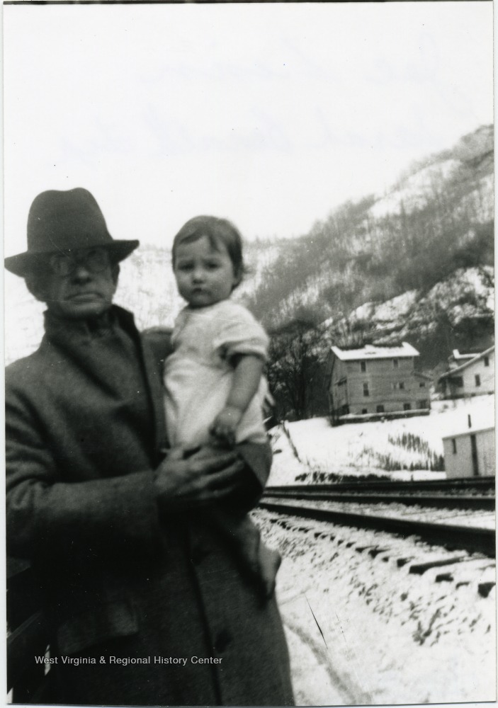 - Man holding little girl with train tracks, houses, and snow covered hillside in the background.