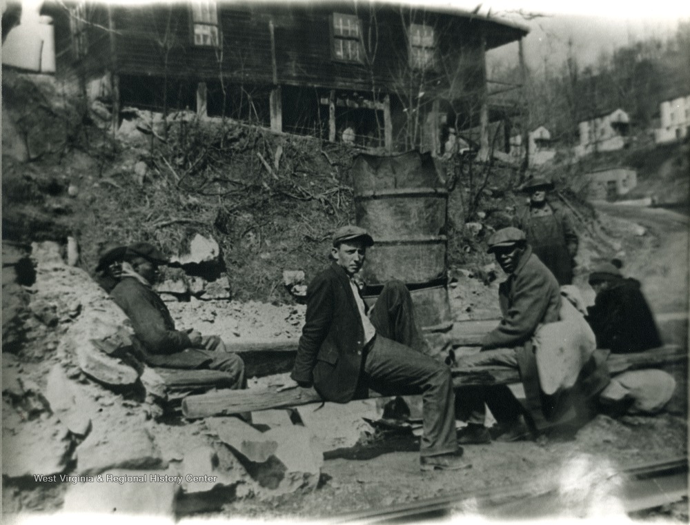 - A group of men sitting on a wooden post. 'For more information on Mountaineer Mining Mission, see A&M 2491 (S.C.)'