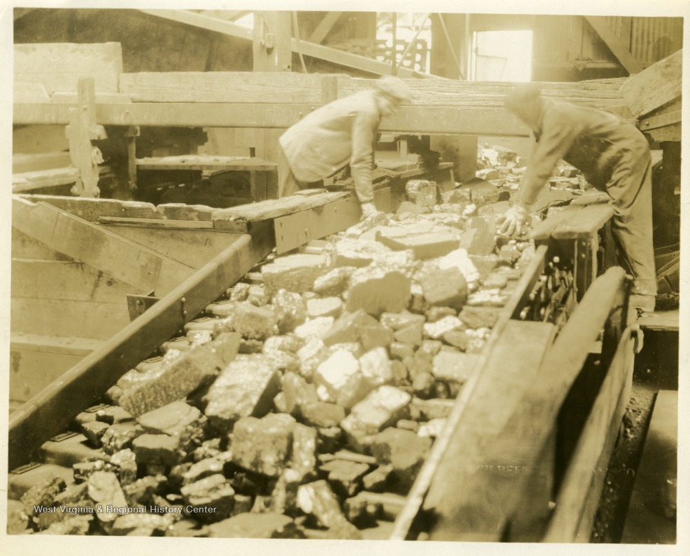 - 'Interior of tipple showing coal on picking table and loading boom.'