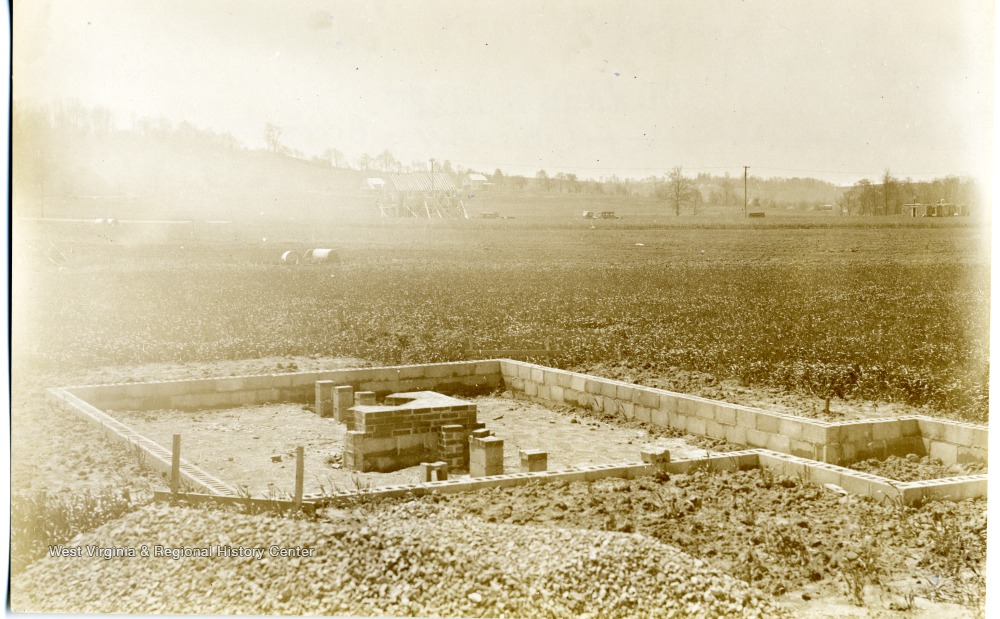 - A homestead foundation in the early stages of being built at Arthurdale, West Virginia.