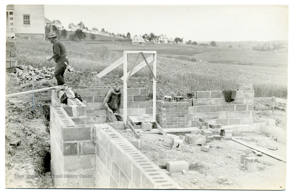 - Men working at the corner of the foundation of a house in Arthurdale.