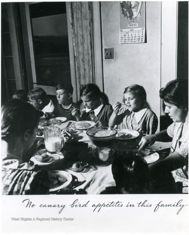 - Family sitting down to a meal. Title at the bottom reads: "No Canary Bird Appetites in this Family". 'Album 359, FSA - Arthurdale W. Va. A print from the FDR Library collection. This print is furnished for this file and must not be reproduced without the owner's permission.'
