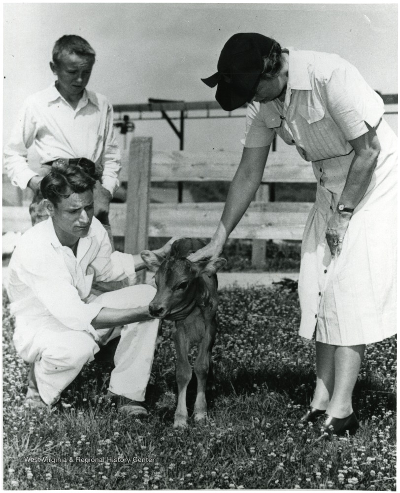 - First lady Eleanor Roosevelt pets calf of prize winning cow in farmyard in Arthurdale, W. Va. ' A print from the FDR Library Collection. This print is furnished for you fil and must not be reproduced without the owner's permission. Owner: UPI (acme)'