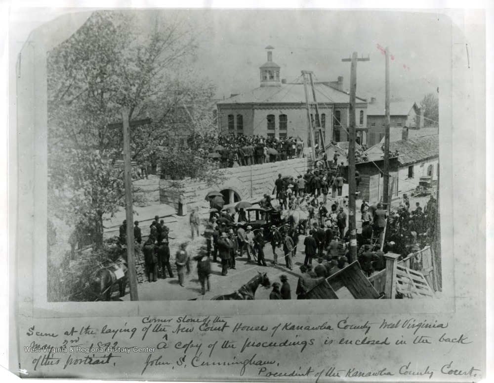 - 'Scene at the laying of the corner stone of the new Court House of Kanawha County, West Virginia. A copy of the proceedings is enclosed in the back of this portrait. John S. Cunningham, President of the Kanawha County Court.'