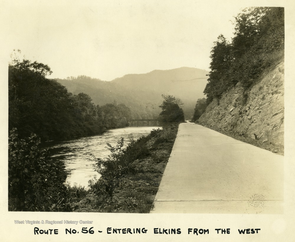 - Route No. 56 which enters Elkins, West Virginia from the west. The road is next to a river.