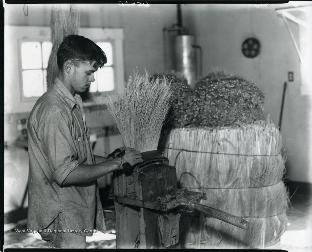 - A man with a broom in a press at the Reliable Broom Plant in Grafton, West Virginia.