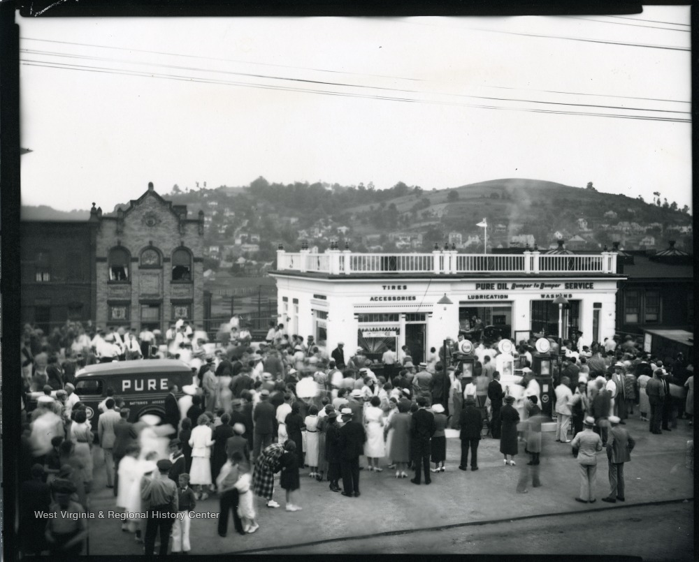 - A large crowd outside the Pure Oil Gas Station in Grafton, West Virginia.