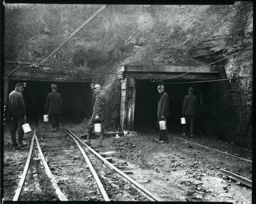- Five coal miners carrying lunch buckets enter shafts at an unidentified coal mine near Grafton, West Virginia.