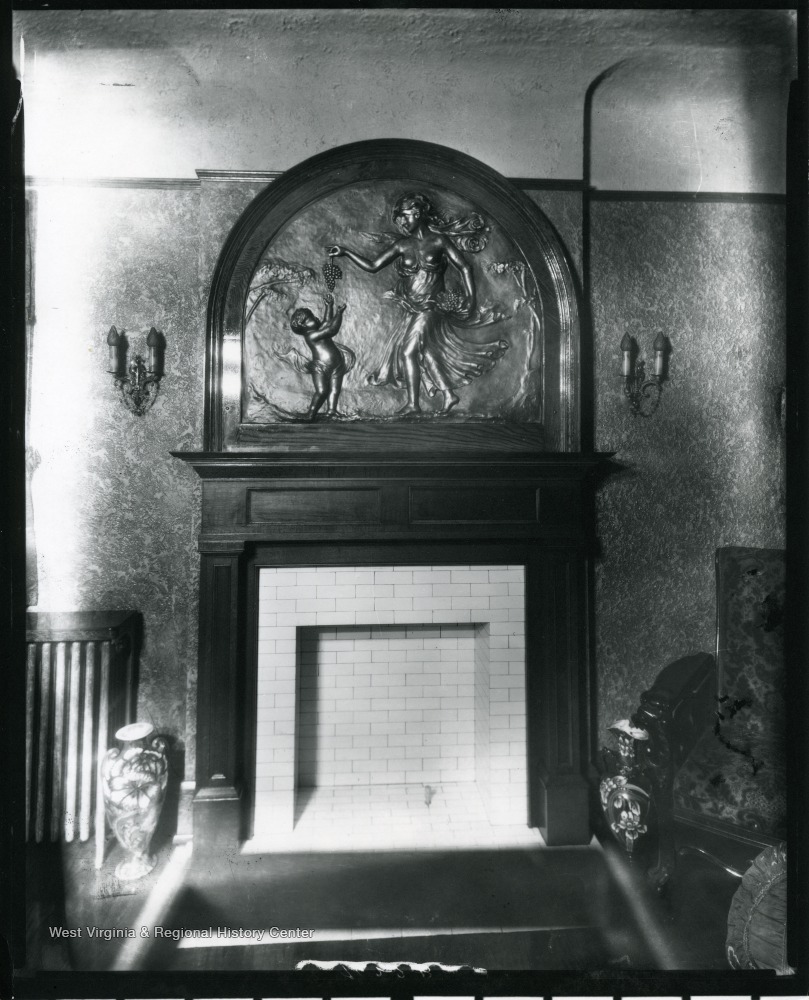 - Ornate fireplace with large mantle piece with a woman giving a child grapes. Grafton, W. Va.