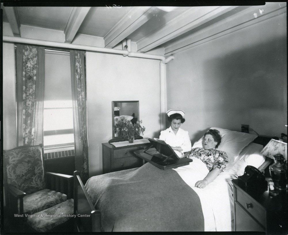 - Woman lying in a hospital bed being attended by a nurse in Grafton, W. Va.