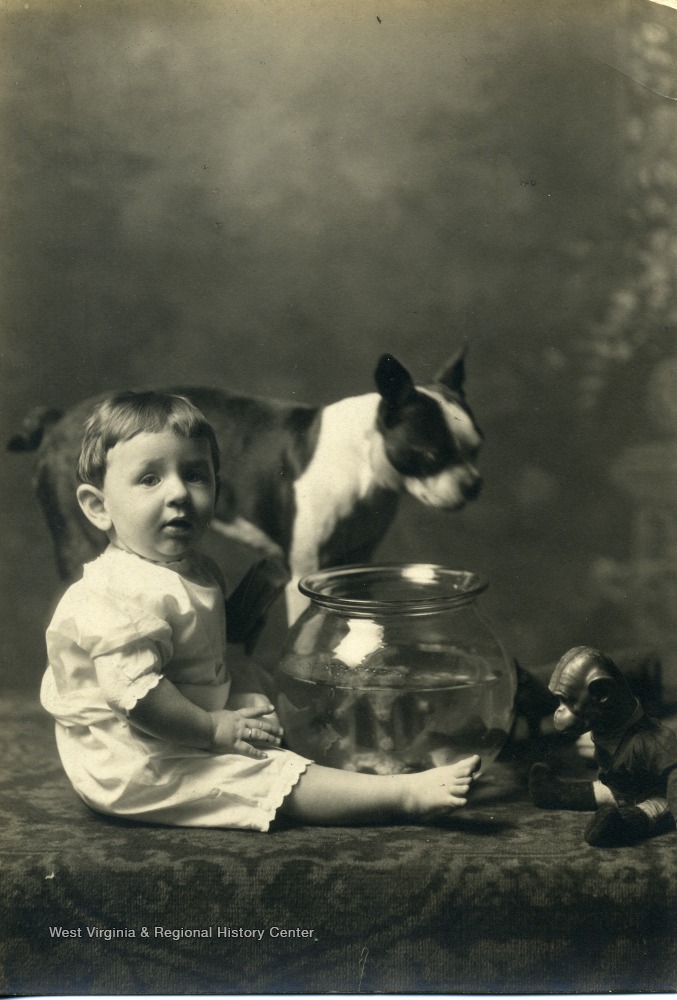 - Young Child With Fishbowl, Dog and Monkey Toy, Grafton, W. Va.