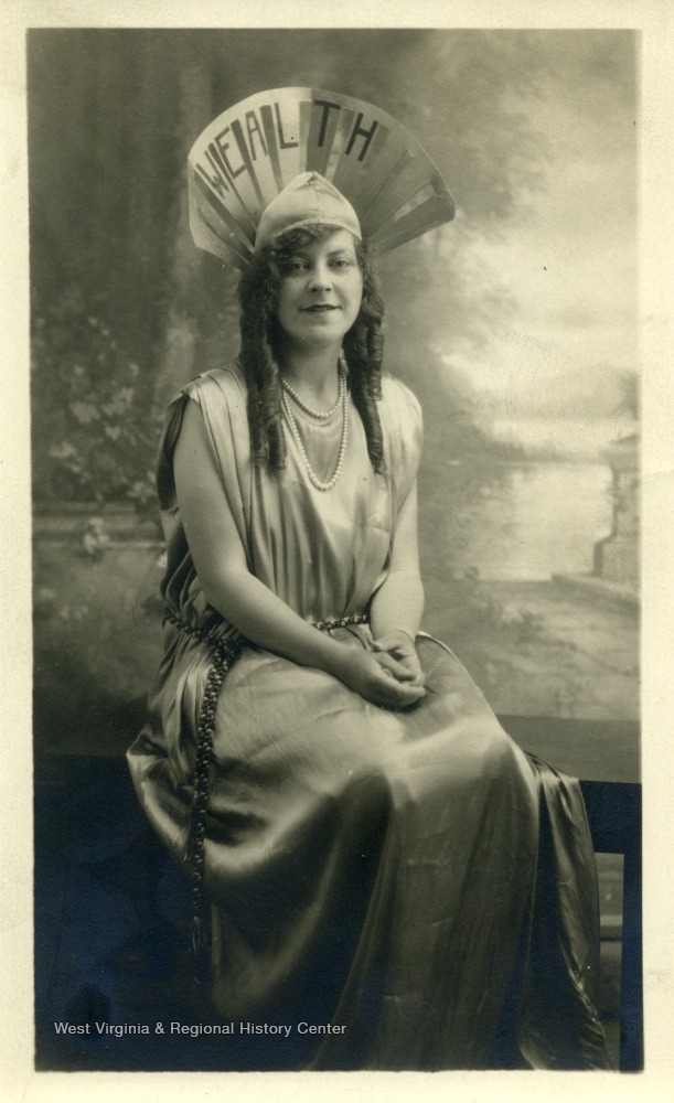 - A picture postcard of a woman in costume, sitting in front of a painted background. She is wearing a hat with the word Wealth on it and a long dress.