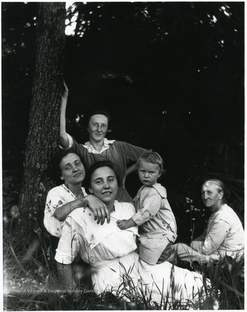 - Group photo of the Aegerter Family. Leaning on the tree: Olga Aegerter Holtkamp. Old Woman: Marianna Aegerter. Helvetia, W. Va.