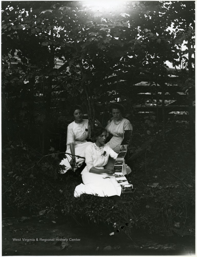 - Three women sitting in forested area looking at postcard foldout book. Helvetia, W. Va.