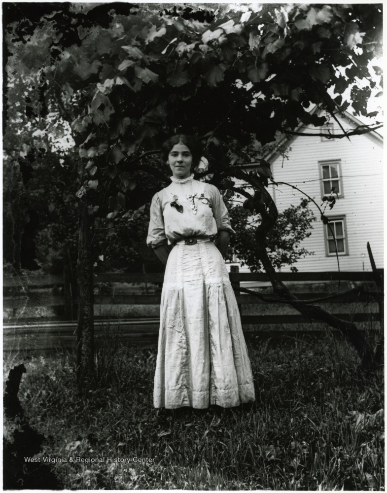 - Young woman standing alone in front of a tree. House in the background. Helvetia, W. Va.