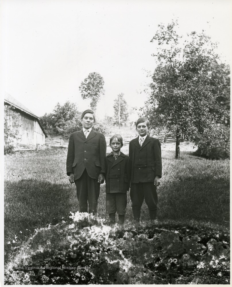 - Three young boys wearing suits are standing in a field in Helvetia, West Virginia.