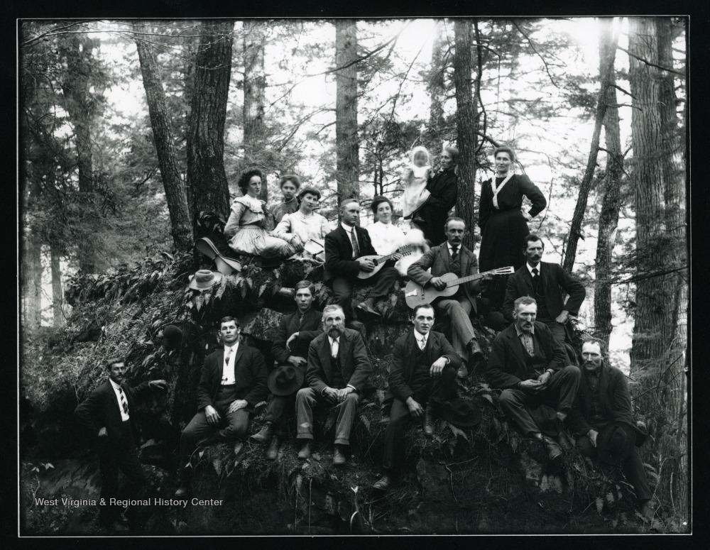 - Musicians and others on an outcropping in the forest near Helvetia, West Virginia.