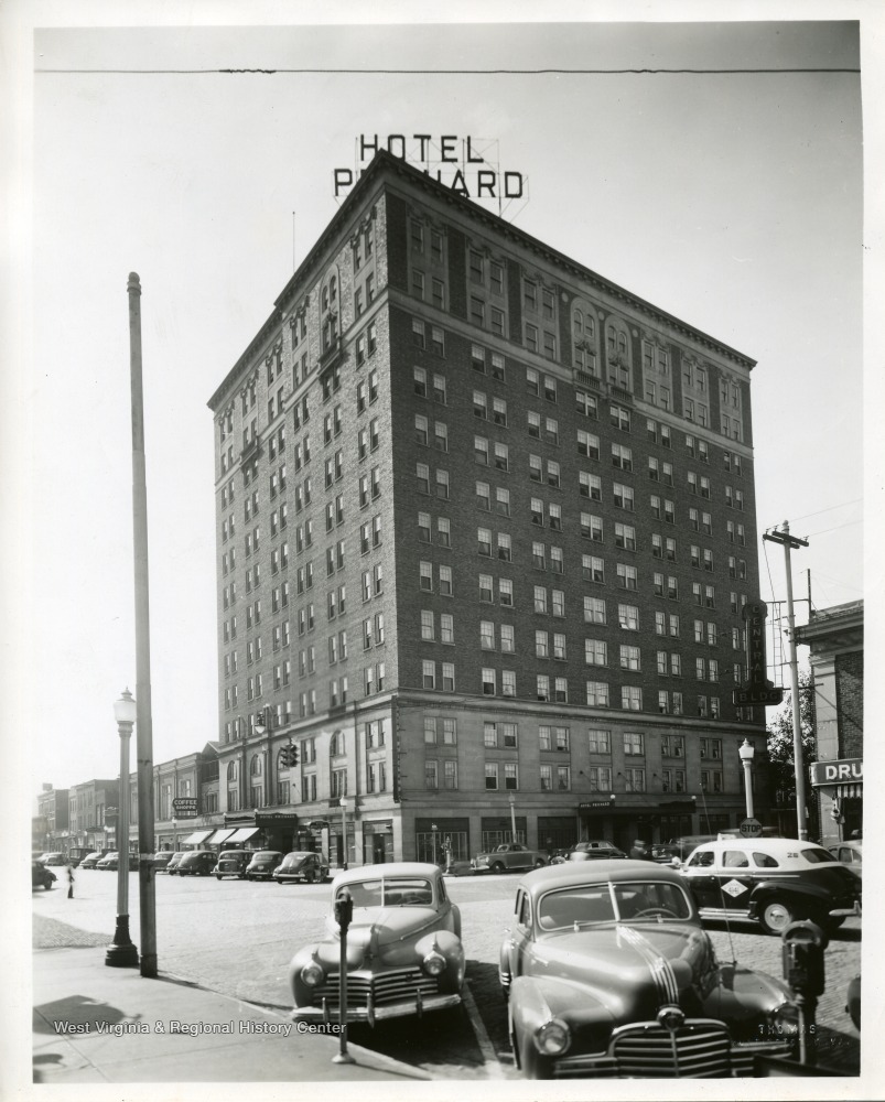 - Automobiles are parked in front of the Hotel Prichard building in Huntington, West Virginia. The hotel is located between the Coffee Shoppe and a Drug Store.