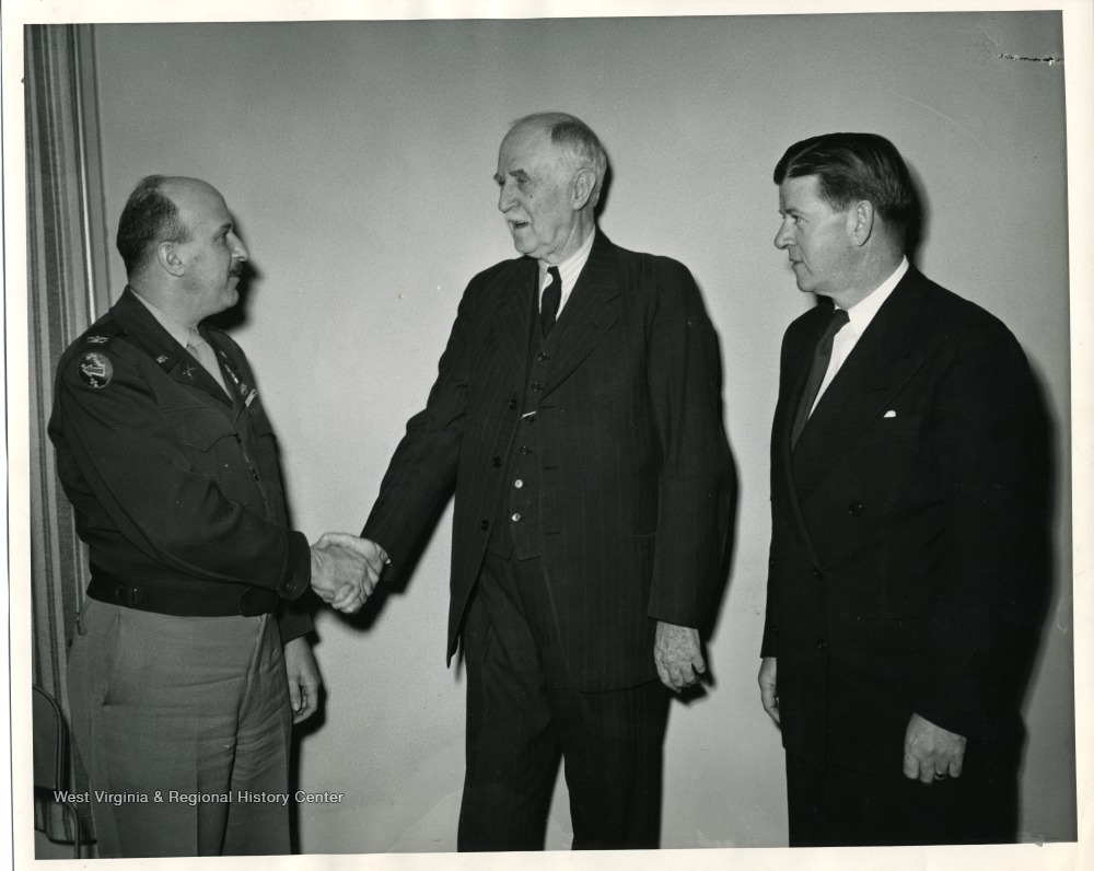 - 'March 22, 1947. On occasion of the citation of George S. Wallace for civilian service in World War II. Left to right: Colonel J.G. Hearne, George S. Wallace, and Mayor Douglas C. Tomkies.'