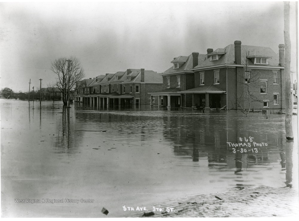 - 6th Avenue covered in water after the Huntington flood. Porches of homes are submerged.