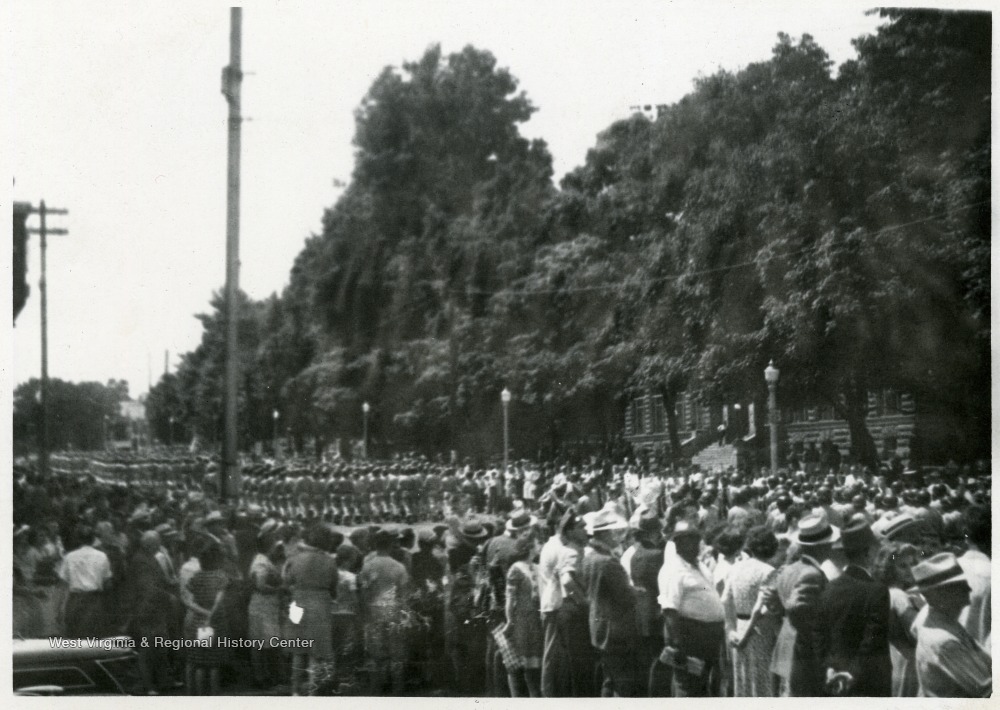 - Large group of soldiers marching in a parade while a crowd stands on the street and watches the parade, Huntington, W. Va.