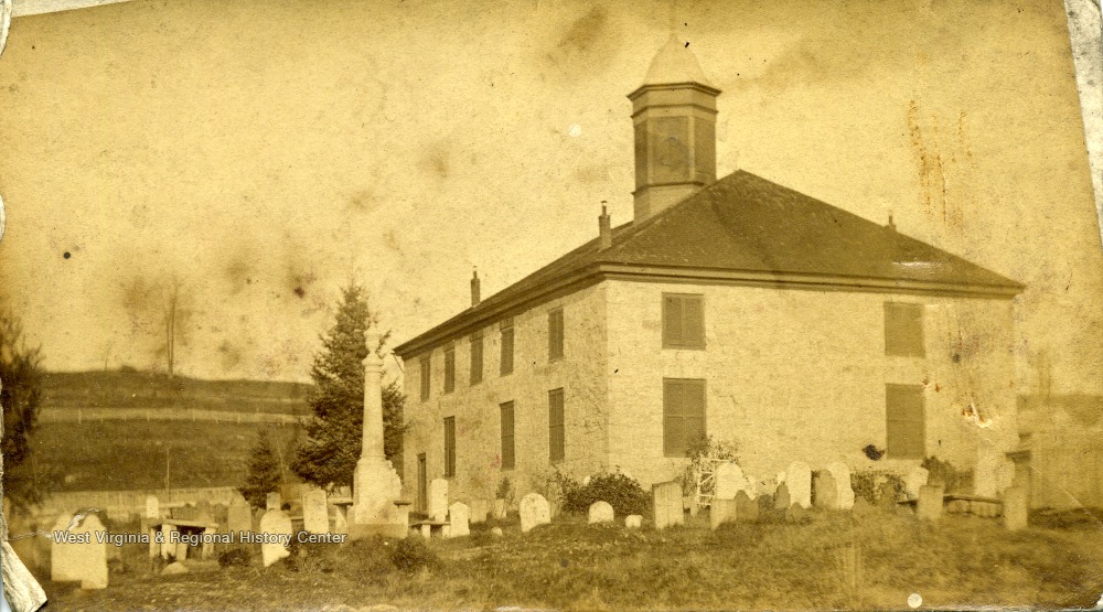 - Old stone church with shutters closed on the windows. Grave yard outside of the church. Lewisburg, W. Va.