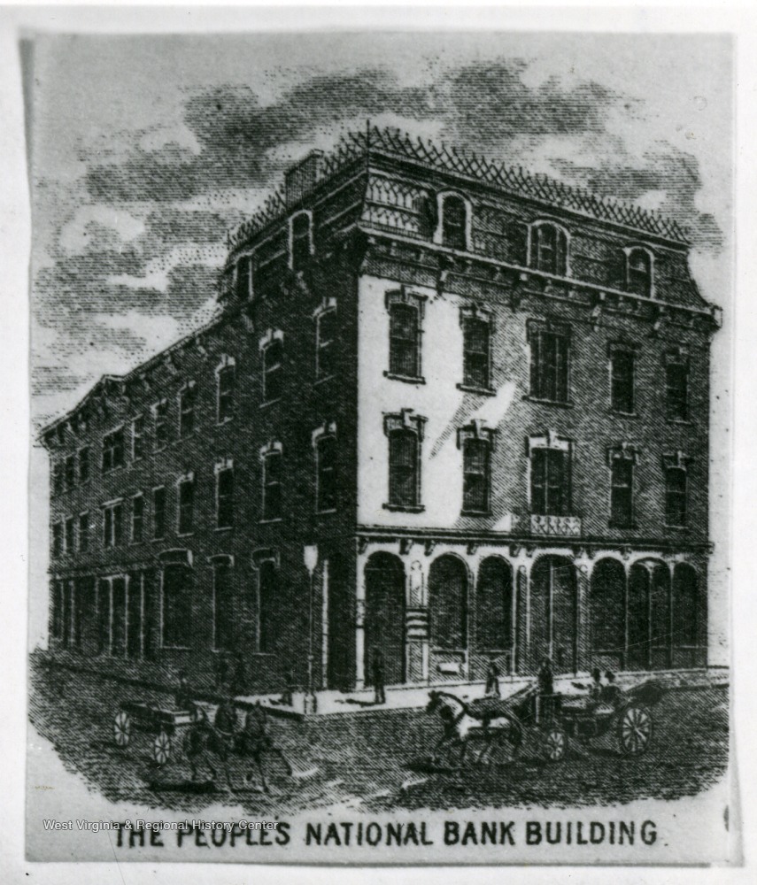 - '1883 cut of the Peoples National Bank Building. Notice the corner entrance in the "horse and buggy" days.'