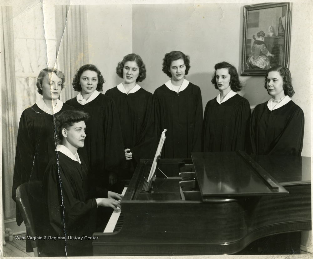 - Six women standing and another woman sitting and playing the piano in choir robes. Martinsburg, W. Va.