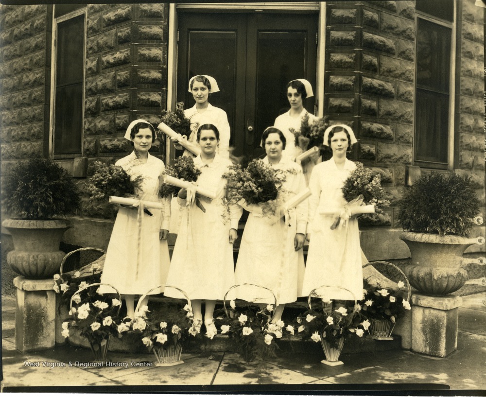 - Six nurses standing on the stairs of the city hospital. In their arms bouquets of flowers and in front of them baskets of flowers, Martinsburg, W. Va.