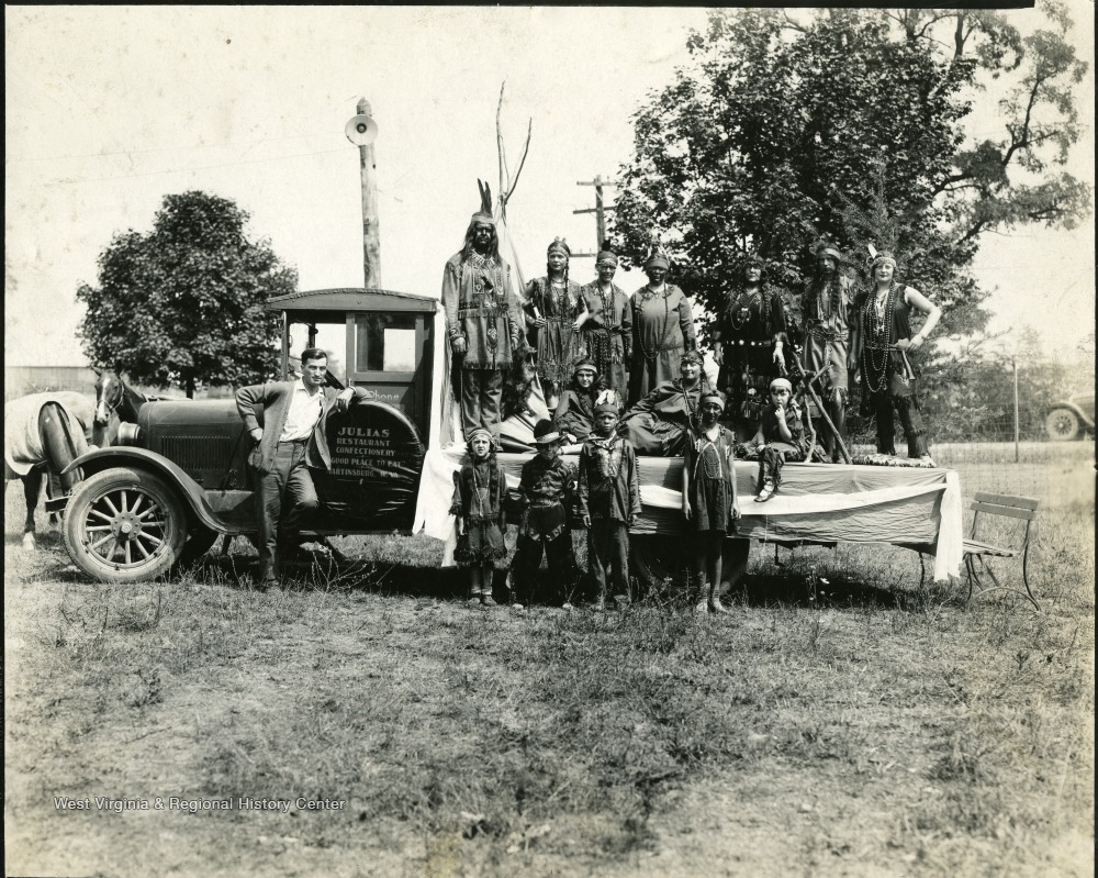 - People are standing on the back of a Julias Restaurant Confectionery truck, possible a float in the Apple Blossom Festival Parade.