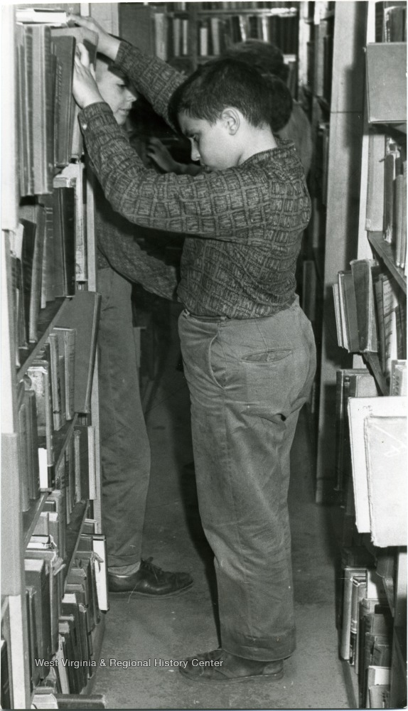 - Young boy pulling a book off the shelf in the Waitman Barbe Public Library.