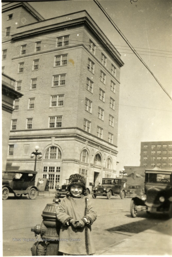 - Young girl standing by fire hydrant across from Hotel Morgan. Automobiles along side the road.