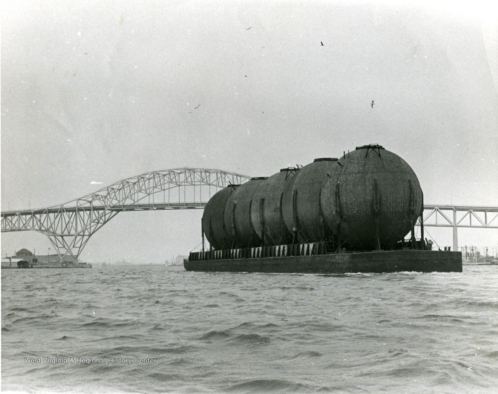 - Storage tanks from Morgantown Ordnance Works taken at the mouth of the Mississippi River. Large bridge seen behind the storage tanks.
