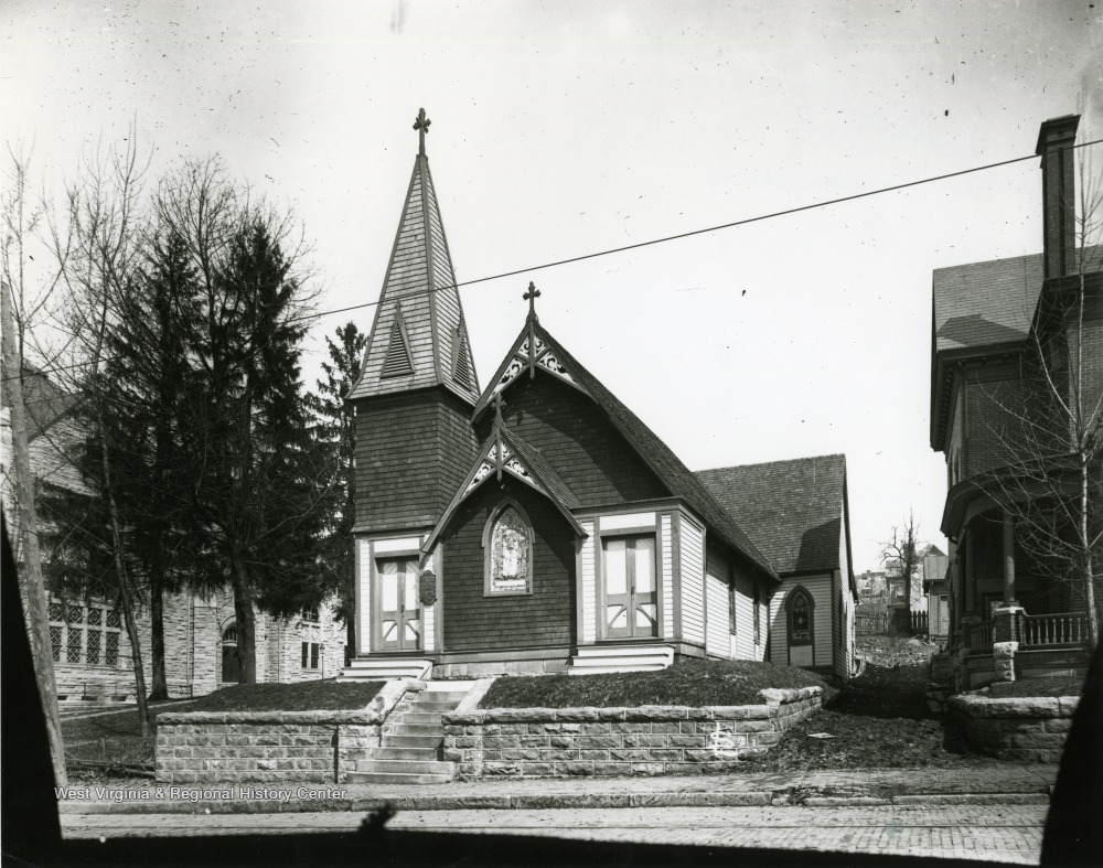 - Front view of Episcopal Church located in Morgantown, W. Va. Wooden church building has stained-glass windows.
