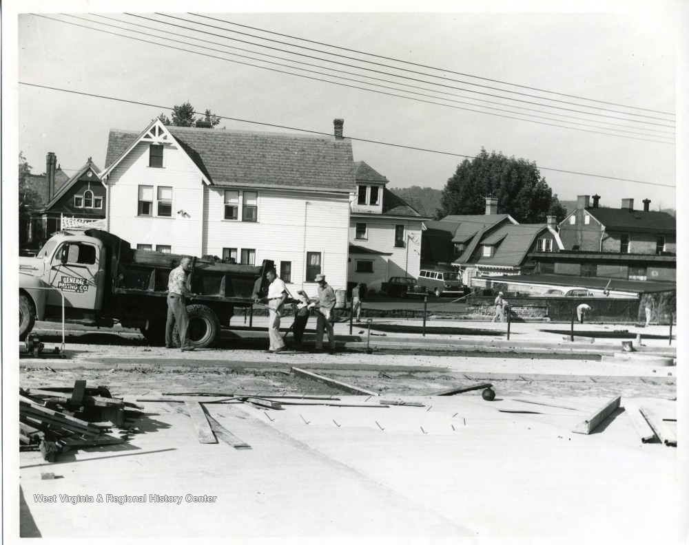 - Construction workers are paving the parking lot at Spruce and Pleasant Streets in Morgantown, West Virginia. The paving company is General Paving Company of Morgantown, West Virginia.
