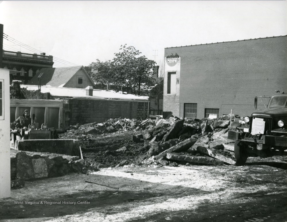 - Constructing Parking lot located near the High Street, Fayette Street, and Chestnut Street intersections. Worker on bulldozer removing concrete and dirt.