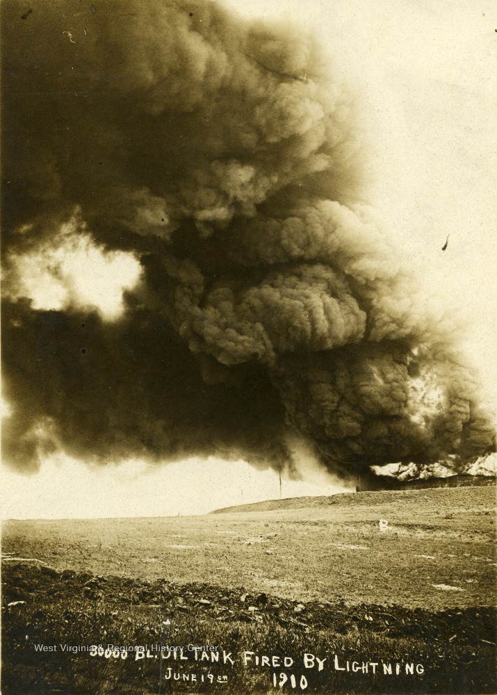 - 30,000 Barrel Oil tank fire triggered by lightning in Morgantown, W. Va. Smoke fills the sky.