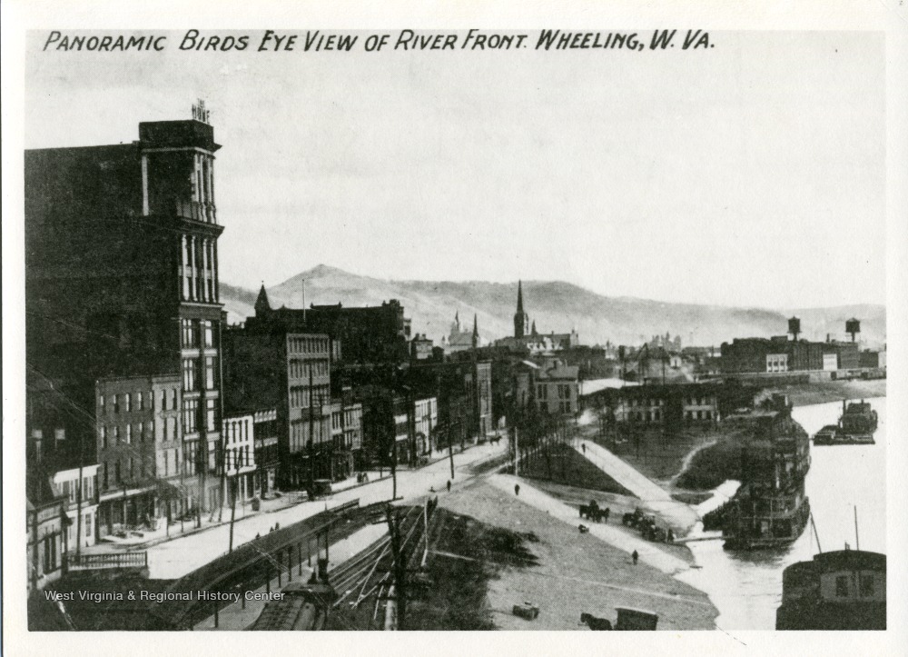 - A picture postcard of the River Front in Wheeling, West Virginia. River boats at the Wharf on the Ohio River.