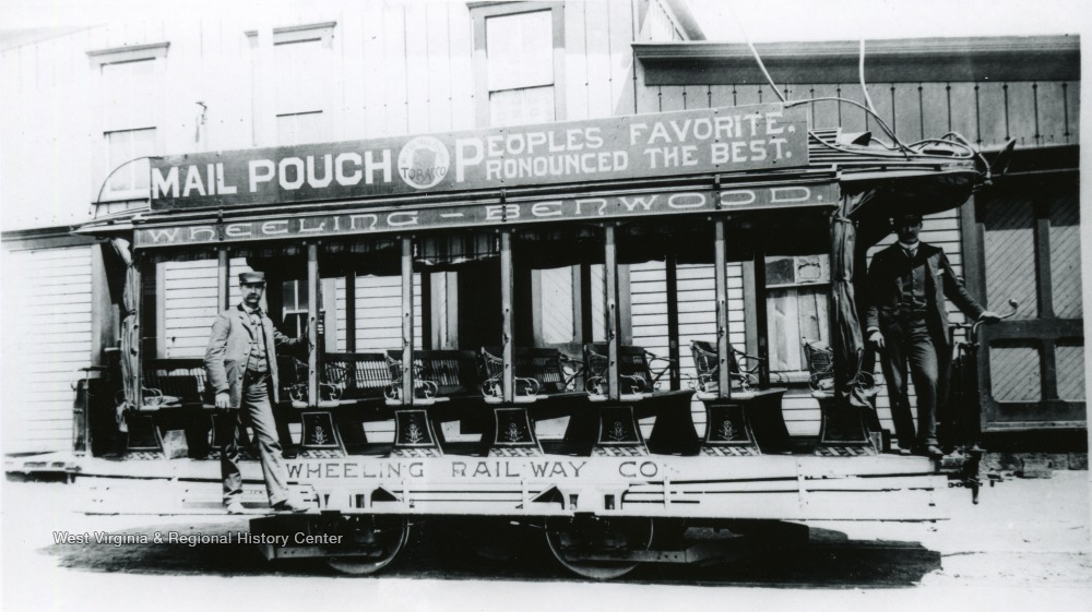 - Wheeling to Benwood Traction Car and conductors. Mail Pouch Advertisement on top of the car.