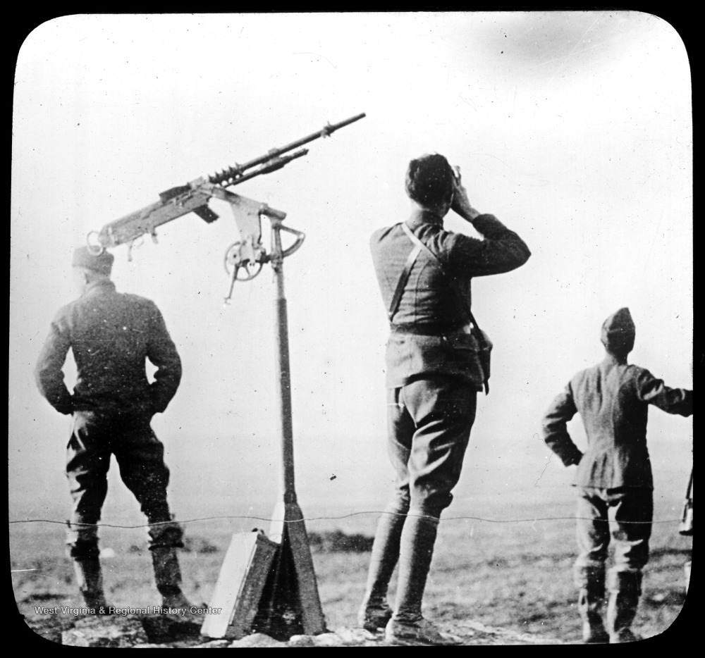 - World War I Lantern Slide Show. Slide No. 37 in group of originally numbered slides. Anti-aircraft gun and three soldiers. Frame is labelled with text saying 'Visual Bureau, University of Pittsburgh.' (negative no. 37-7593 is inscribed on slide)