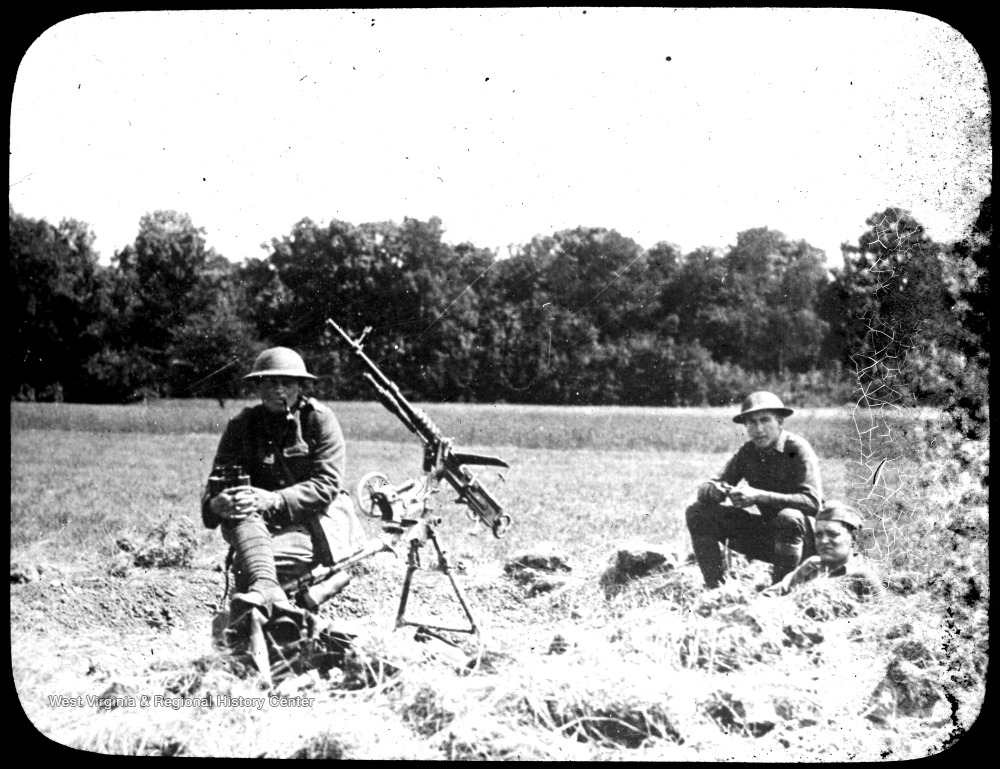 - World War I Lantern Slide Show. Slide No. 38 in group of originally numbered slides. Anti-aircraft gun and three soldiers in a field. One soldier has binoculars and is smoking a pipe. Frame is labelled with text saying 'Visual Bureau, University of Pittsburgh.' (negative no. 38-17029 is inscribed on slide)