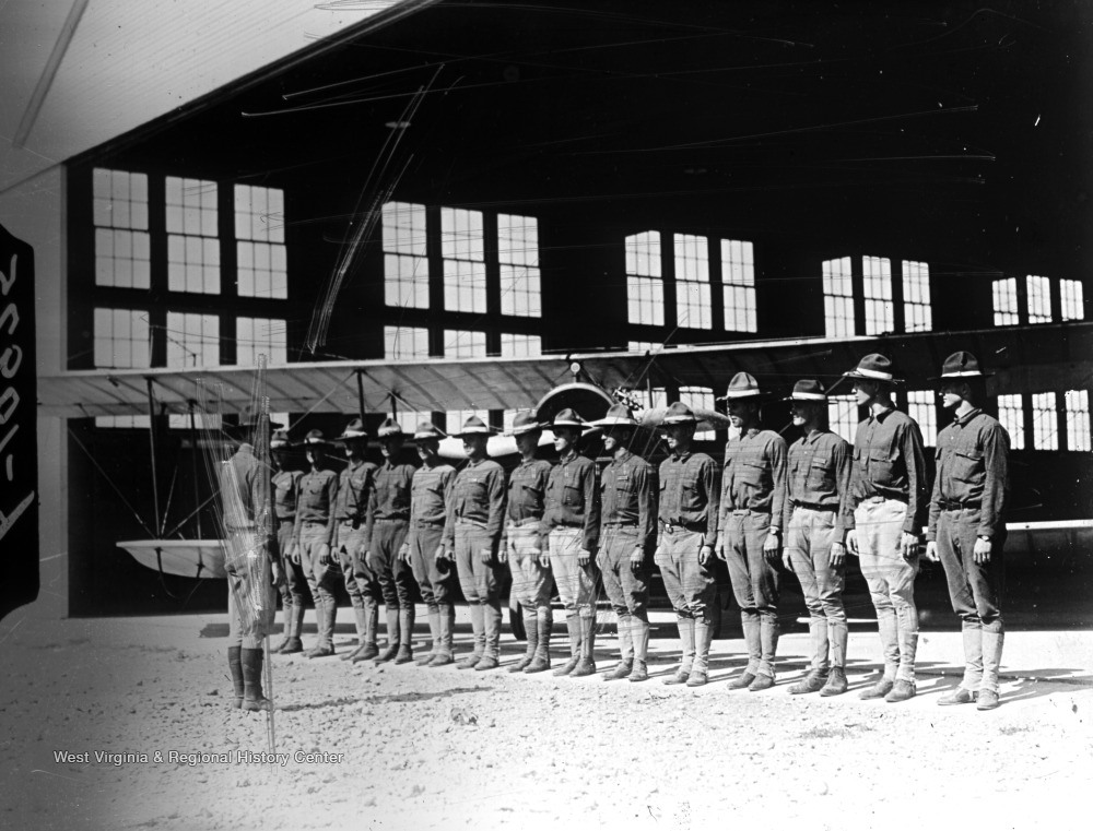 - World War I Lantern Slide Show. In group of originally numbered slides. (Number label is lost.) American student pilots standing at attention in front of a biplane in a hanger. (negative no. L-10975 is inscribed on slide)