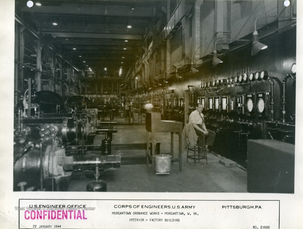 - 'U. S. Engineer Office, Corps of Engineers, U. S. Army, Pittsburgh, PA. Morgantown Ordnance Works, Morgantown, W. Va. Interior - Factory Building. 22 January 1944, No. 21680.'