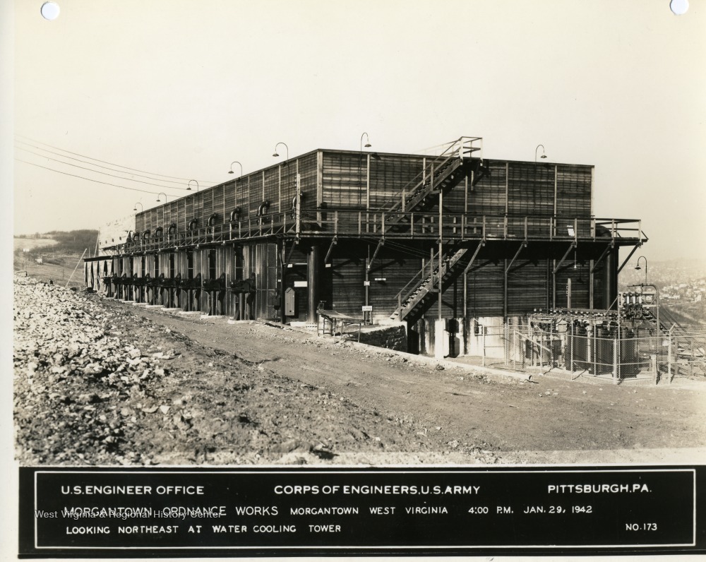 - 'U. S. Engineer Office, Corps of Engineers, U. S. Army, Pittsburgh, PA. Morgantown Ordnance Works, Morgantown, W. Va. 4:00 P.M. Jan. 29, 1942. Looking Northeast at water cooling tower. No. 173.'