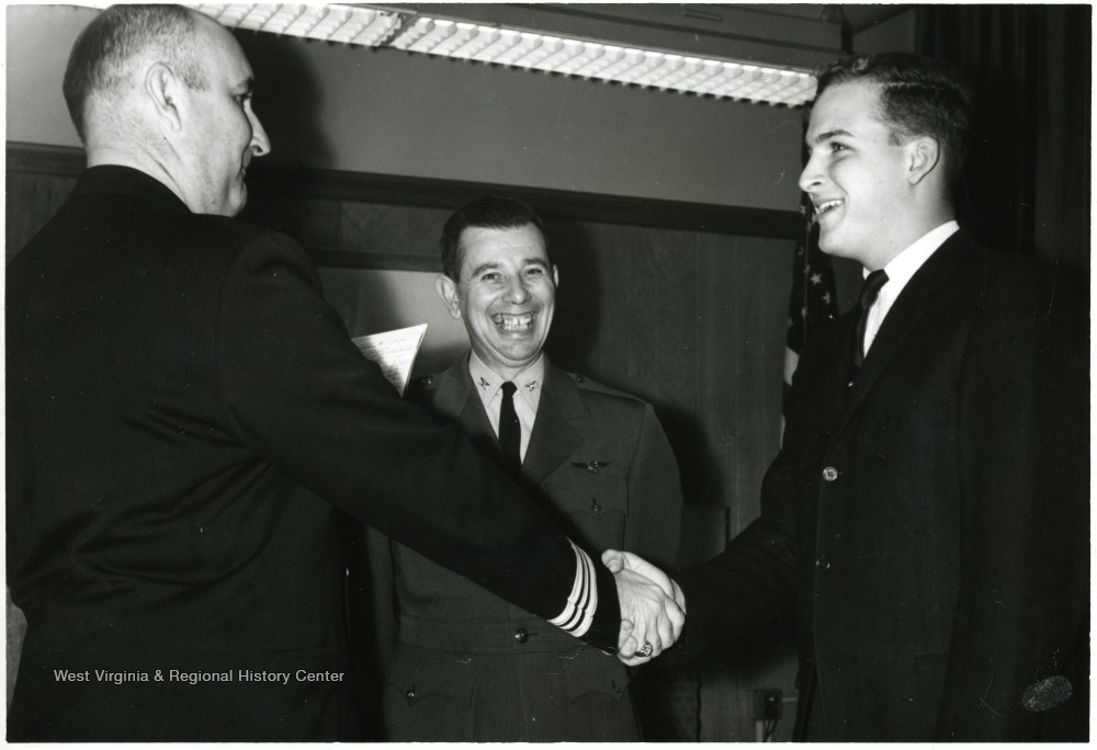 - A young man shakes hands with what appears to be a man from the Military, another man from the Air Force stands in the background.